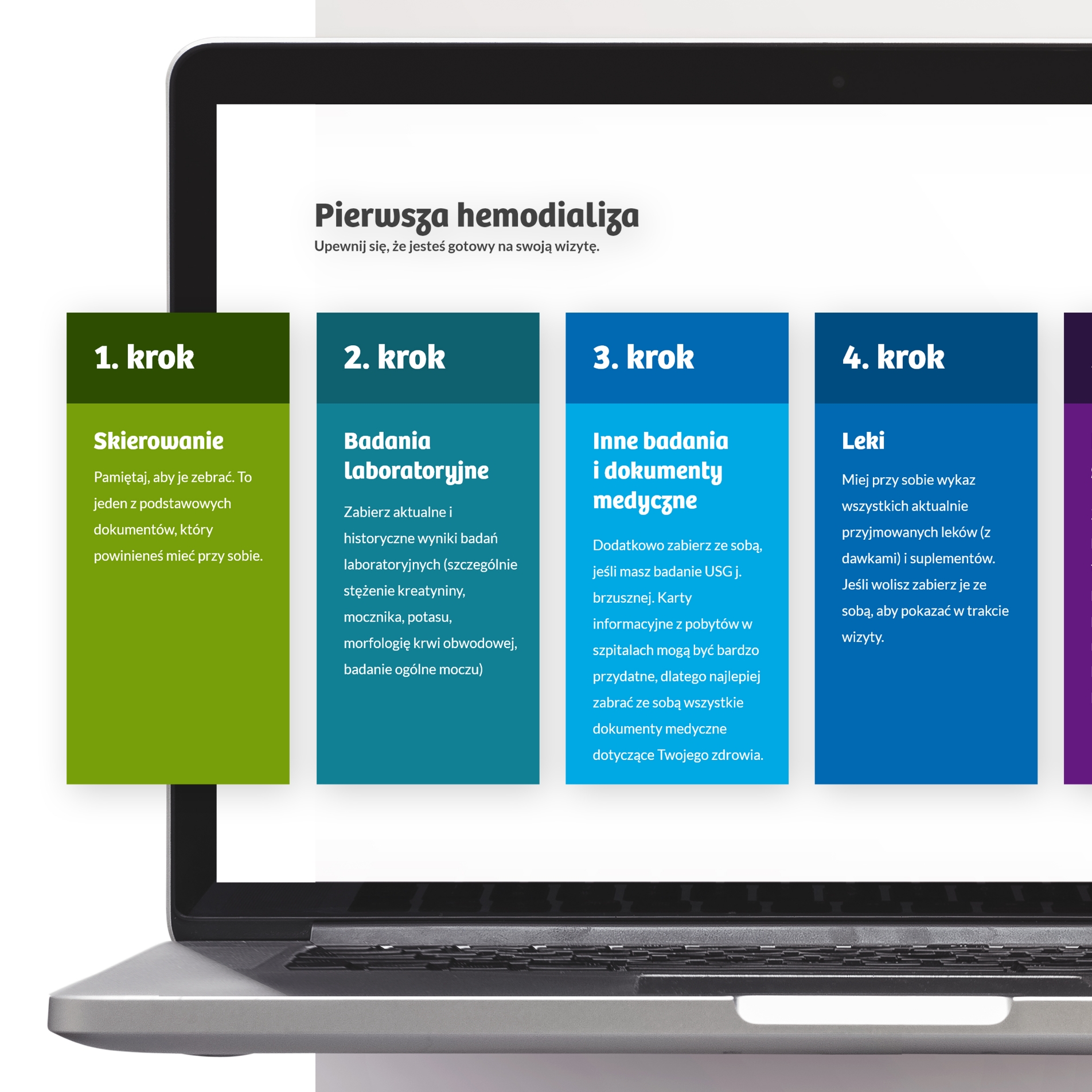 Zaprojektowaliśmy samouczki online, które krok po kroku wprowadzają nowych pacjentów w proces leczenia i korzystania z usług DaVita. Postawiliśmy na prosty język, przejrzyste grafiki i logiczny podział treści, tak aby informacje były łatwe do przyswojenia nawet w trudnych, stresujących momentach.